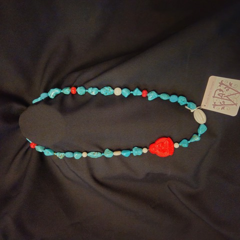 Add a bold touch of balance and beauty to your jewelry collection with this striking turquoise necklace, featuring a vibrant red Buddha accent as its centerpiece. The rich turquoise stones are known for their calming energy and timeless appeal, while the red Buddha adds a pop of color and a meaningful symbol of peace, wisdom, and grounding.